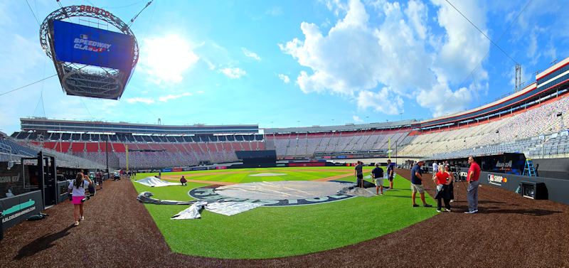 If you think that it was a tight fit getting the baseball field into this “short-track” venue, think again. Because the baseball field only occupies half of the track’s infield space, “there is so much space left for the concert stage, clubhouses, our tent village (for media and other operations), concessions, bathrooms and a fan plaza,” explains Yolkut. “All of these have always been outside the ballparks at the jewel events, but now there’s space for all of that on the inside.”